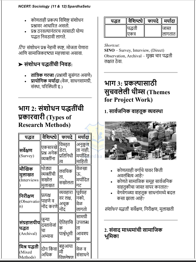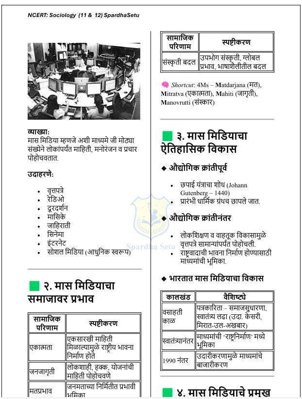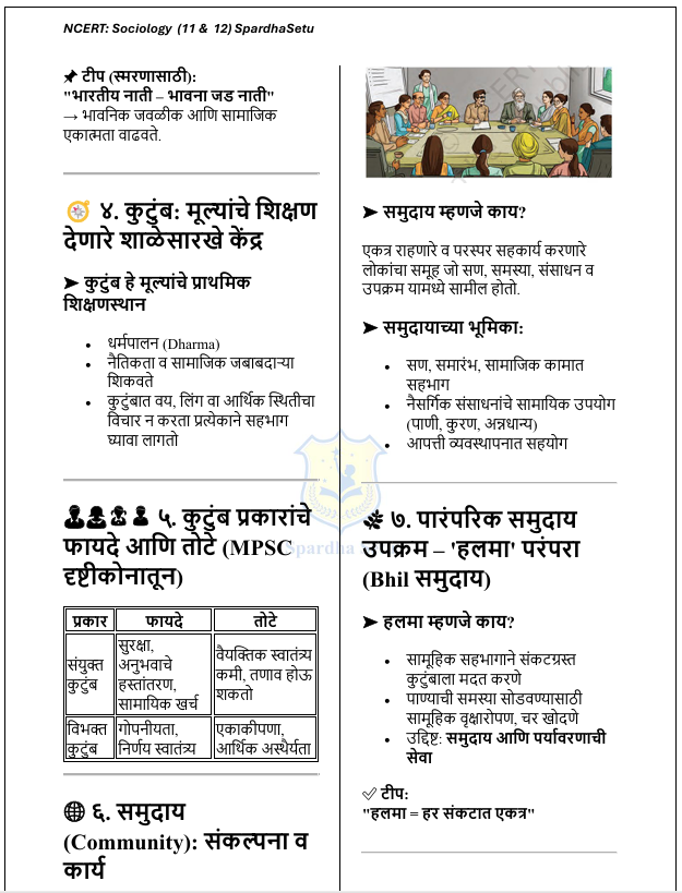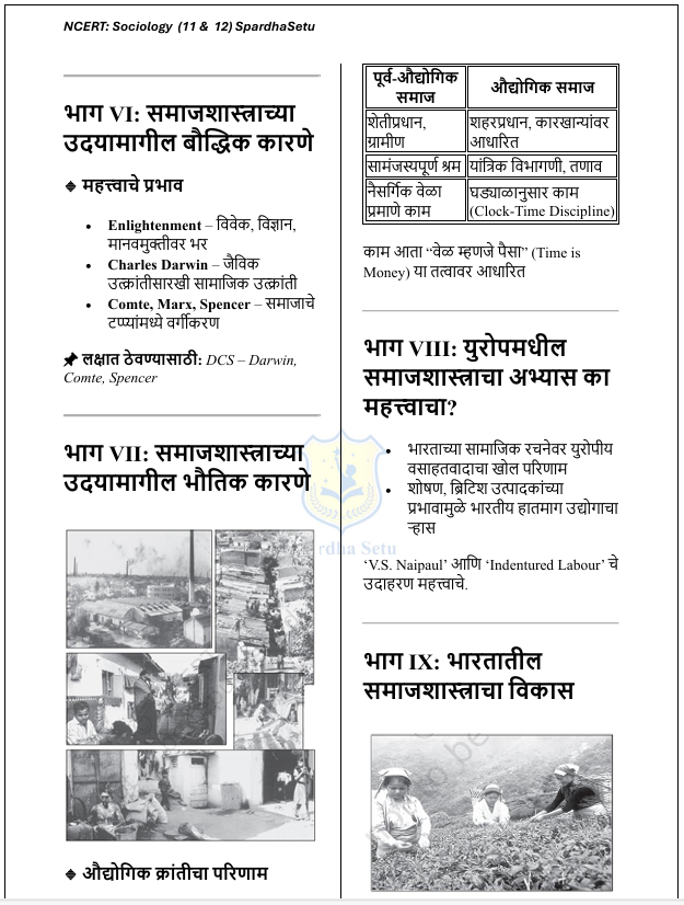 рд╣реЗ рдИ-рдмреБрдХ NCERT рд╕рдорд╛рдЬрд╢рд╛рд╕реНрддреНрд░ (рдЗрдпрддреНрддрд╛ 6 рддреЗ 12) рдпрд╛ рд╕рдВрдкреВрд░реНрдг рдЕрднреНрдпрд╛рд╕рдХреНрд░рдорд╛рд╡рд░ рдЖрдзрд╛рд░рд┐рдд рдЕрд╕реВрди, рд╕реНрдкрд░реНрдзрд╛ рдкрд░реАрдХреНрд╖рд╛рдВрдЪреНрдпрд╛ рджреГрд╖реНрдЯреАрдиреЗ рдЙрдкрдпреБрдХреНрдд рдЕрд╢рд╛ рдкрджреНрдзрддреАрдиреЗ рд╕рдВрдХрд▓рд┐рдд рдХрд░рдгреНрдпрд╛рдд рдЖрд▓реЗ рдЖрд╣реЗ. рд╕рдорд╛рдЬрд░рдЪрдирд╛, рд╕рд╛рдорд╛рдЬрд┐рдХ рд╕рдВрд╕реНрдерд╛, рд╕рдВрд╕реНрдХреГрддреА, рд╕рд╛рдорд╛рдЬрд┐рдХ рдмрджрд▓, рдЧреНрд░рд╛рдореАрдг-рд╢рд╣рд░реА рд╕рдорд╛рдЬ рддрд╕реЗрдЪ рднрд╛рд░рддреАрдп рд╕рдорд╛рдЬрд╛рд╢реА рд╕рдВрдмрдВрдзрд┐рдд рд╕рдВрдХрд▓реНрдкрдирд╛ рд╕реЛрдкреНрдпрд╛, рдиреЗрдордХреНрдпрд╛ рдЖрдгрд┐ рдкрд░реАрдХреНрд╖рд╛рднрд┐рдореБрдЦ рднрд╛рд╖реЗрдд рдорд╛рдВрдбрдгреНрдпрд╛рдд рдЖрд▓реНрдпрд╛ рдЖрд╣реЗрдд. рд╣реЗ рдкреБрд╕реНрддрдХ MPSC (рд░рд╛рдЬреНрдп рд╕реЗрд╡рд╛ рд╡ рд╕рд░рд│рд╕реЗрд╡рд╛), рдорд╣рд╛рд░рд╛рд╖реНрдЯреНрд░ рдкреЛрд▓реАрд╕ рднрд░рддреА, PSI / STI / ASO, рд╕рдВрдпреБрдХреНрдд рдкреВрд░реНрд╡ рдкрд░реАрдХреНрд╖рд╛ рддрд╕реЗрдЪ рдЗрддрд░ рд╕рд░реНрд╡ рд╕реНрдкрд░реНрдзрд╛ рдкрд░реАрдХреНрд╖рд╛рдВрд╕рд╛рдареА рд╡рд┐рд╢реЗрд╖рддрдГ рдЙрдкрдпреБрдХреНрдд рдЖрд╣реЗ. NCERT рдордзреАрд▓ рдореВрд▓рднреВрдд рд╕рдорд╛рдЬрд╢рд╛рд╕реНрддреНрд░реАрдп рд╕рдВрдХрд▓реНрдкрдирд╛ рд╕реНрдкрд╖реНрдЯ рдХрд░рдд рдЙрджрд╛рд╣рд░рдгреЗ, рд╕рд╛рдорд╛рдЬрд┐рдХ рдкреНрд░рдХреНрд░рд┐рдпрд╛ рдЖрдгрд┐ рд╡рд┐рд╢реНрд▓реЗрд╖рдгрд╛рддреНрдордХ рдореБрджреНрджреЗ рдпрд╛рдВрд╡рд░ рднрд░ рджреЗрдгреНрдпрд╛рдд рдЖрд▓рд╛ рдЖрд╣реЗ, рдЬреНрдпрд╛рдореБрд│реЗ Prelims рдЖрдгрд┐ Mains рджреЛрдиреНрд╣реА рдкрд░реАрдХреНрд╖рд╛рдВрд╕рд╛рдареА рдордЬрдмреВрдд рдкрд╛рдпрд╛ рддрдпрд╛рд░ рд╣реЛрддреЛ.