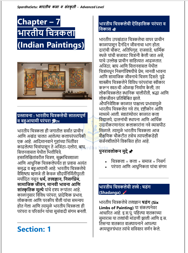 рд╣реЗ рднрд╛рд░рддреАрдп рдХрд▓рд╛ рд╡ рд╕рдВрд╕реНрдХреГрддреА рдИ-рдмреБрдХ (PDF рд╕реНрд╡рд░реВрдкрд╛рдд) Intermediate рддреЗ Advanced Level рд╡рд░реАрд▓ рд╡рд┐рджреНрдпрд╛рд░реНрдереНрдпрд╛рдВрд╕рд╛рдареА MPSC рд╡ UPSC Mains рдкрд░реАрдХреНрд╖рд╛рдВрдЪреНрдпрд╛ рддрдпрд╛рд░реАрд╕рд╛рдареА рддрдпрд╛рд░ рдХрд░рдгреНрдпрд╛рдд рдЖрд▓реЗ рдЖрд╣реЗ. рдЪрд┐рддреНрд░рдХрд▓рд╛, рд╢рд┐рд▓реНрдкрдХрд▓рд╛, рд╕реНрдерд╛рдкрддреНрдп, рдиреГрддреНрдп, рд╕рдВрдЧреАрдд, рд▓реЛрдХрдХрд▓рд╛ рд╡ рд╕рд╛рдВрд╕реНрдХреГрддрд┐рдХ рд╡рд╛рд░рд╕рд╛ рдпрд╛рдВрдЪрд╛ рдЕрднреНрдпрд╛рд╕ рд╡рд┐рд╢реНрд▓реЗрд╖рдгрд╛рддреНрдордХ рд╡ рдЙрддреНрддрд░рд▓реЗрдЦрдирд╛рднрд┐рдореБрдЦ рдкрджреНрдзрддреАрдиреЗ рдорд╛рдВрдбрдгреНрдпрд╛рдд рдЖрд▓рд╛ рдЖрд╣реЗ. рд╕рдВрдХрд▓реНрдкрдирд╛рдВрдЪреА рд╕рдЦреЛрд▓ рдорд╛рдВрдбрдгреА, рдкрд░рд╕реНрдкрд░рд╕рдВрдмрдВрдз рд╡ рдкрд░реАрдХреНрд╖реЗрдд рдЕрдкреЗрдХреНрд╖рд┐рдд рджреГрд╖реНрдЯрд┐рдХреЛрдирд╛рд╡рд░ рд╡рд┐рд╢реЗрд╖ рднрд░ рджреЗрдгреНрдпрд╛рдд рдЖрд▓рд╛ рдЖрд╣реЗ. MPSC рд╡ UPSC (Mains/Advanced) рддрд╕реЗрдЪ рдЗрддрд░ рдЙрдЪреНрдЪрд╕реНрддрд░реАрдп рд╕реНрдкрд░реНрдзрд╛ рдкрд░реАрдХреНрд╖рд╛рдВрд╕рд╛рдареА рд╣реЗ рдПрдХ рдЙрдкрдпреБрдХреНрдд рд╕рдВрджрд░реНрднрдЧреНрд░рдВрде рдЖрд╣реЗ.
