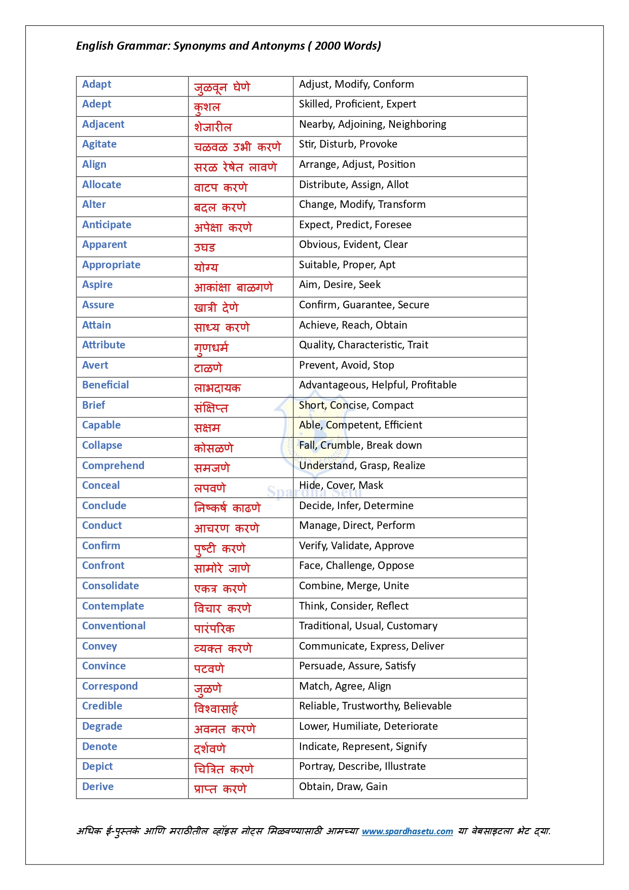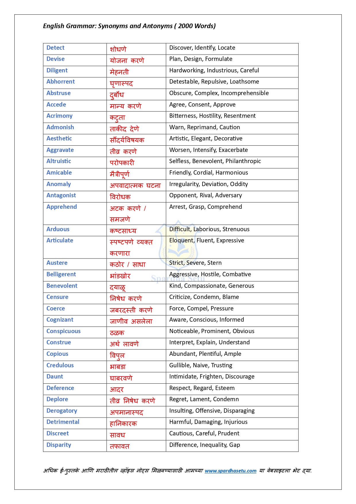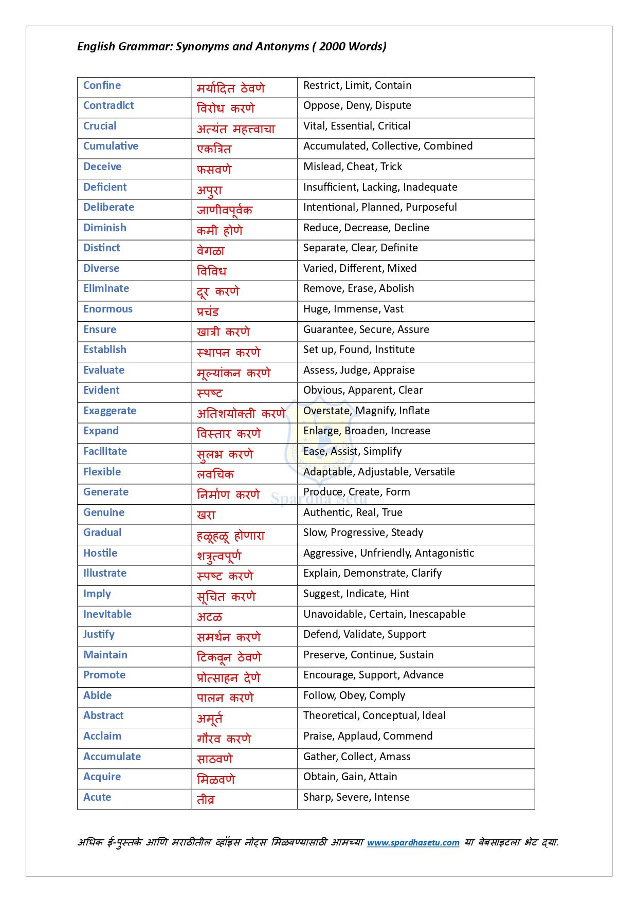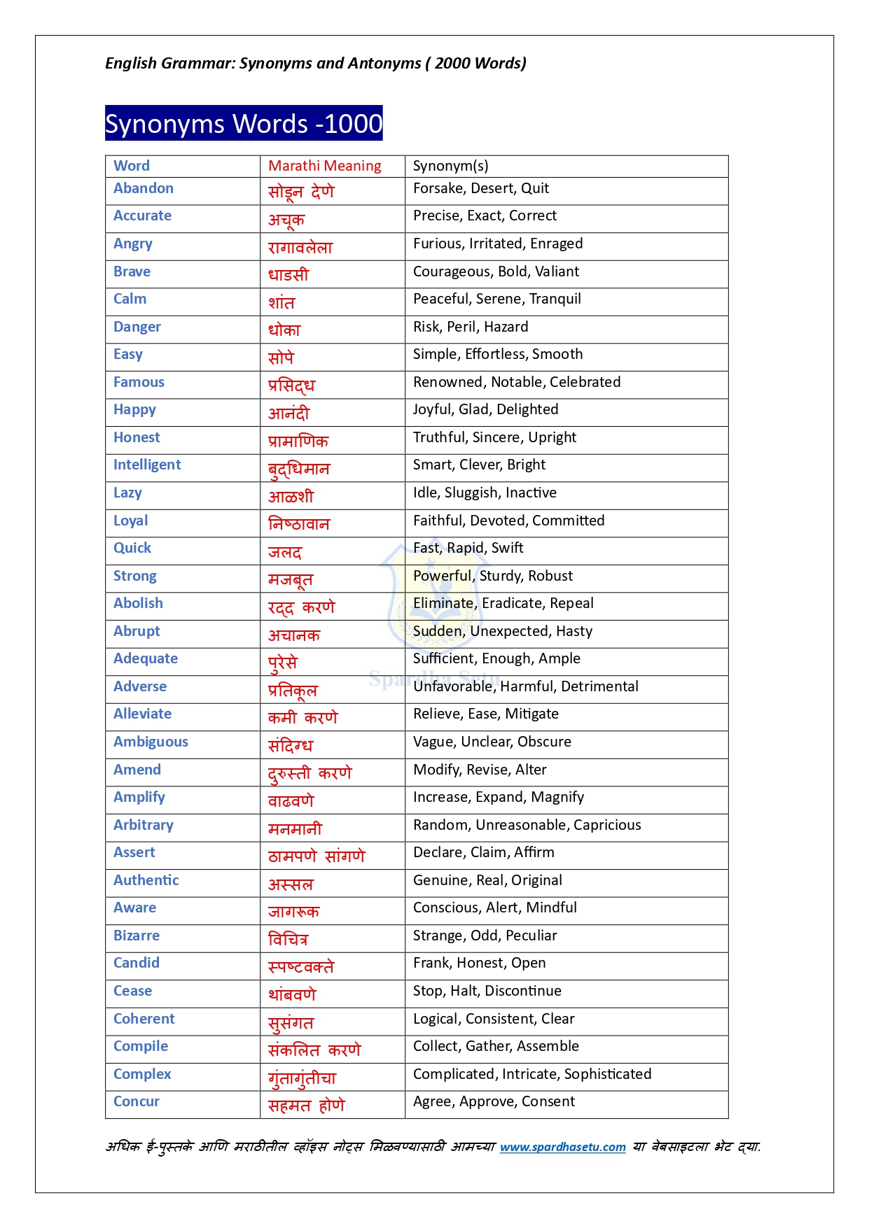 рд╣реЗ рдИ-рдмреБрдХ рдЗрдВрдЧреНрд░рдЬреАрддреАрд▓ реирежрежреж+ рд╕рдорд╛рдирд╛рд░реНрдереА (Synonyms) рдЖрдгрд┐ рд╡рд┐рд░реБрджреНрдзрд╛рд░реНрдереА (Antonyms) рд╢рдмреНрджрд╛рдВрдЪреЗ рд╕рдВрдкреВрд░реНрдг, рдЕрдЪреВрдХ рдЖрдгрд┐ рд╕реЛрдкреНрдпрд╛ рднрд╛рд╖реЗрддреАрд▓ рд╕рдВрдХрд▓рди рд╕рд╛рджрд░ рдХрд░рддреЗ. рд╢рдмреНрджрд╛рдВрдЪрд╛ рдЕрд░реНрде, рд╡рд╛рдкрд░ рдЖрдгрд┐ рдпреЛрдЧреНрдп рдЬреЛрдбреНрдпрд╛ рд╕рдордЬрдгреНрдпрд╛рд╕рд╛рдареА рджрд┐рд▓реЗрд▓реЗ рд╕реНрдкрд╖реНрдЯ рд╡рд░реНрдЧреАрдХрд░рдг рд╡рд┐рджреНрдпрд╛рд░реНрдереНрдпрд╛рдВрдЪреА рд╢рдмреНрджрд╕рдВрдкрджрд╛ рдордЬрдмреВрдд рдХрд░рддреЗ рдЖрдгрд┐ рдкрд░реАрдХреНрд╖рд╛-рдЖрдзрд╛рд░рд┐рдд рдкреНрд░рд╢реНрди рд╕реЛрдбрд╡рдгреЗ рд╕реЛрдкреЗ рдмрдирд╡рддреЗ. SSC, Banking, Railway, MPSC, UPSC рддрд╕реЗрдЪ рд╕рд░реНрд╡ рдЗрдВрдЧреНрд░рдЬреА рд╕реНрдкрд░реНрдзрд╛ рдкрд░реАрдХреНрд╖рд╛рдВрд╕рд╛рдареА рд╣реЗ рдИ-рдмреБрдХ рдЕрддреНрдпрдВрдд рдЙрдкрдпреБрдХреНрдд рдЖрд╣реЗ. рдЗрдВрдЧреНрд░рдЬреА рд▓реЗрдЦрди, рд╡рд╛рдЪрди рдЖрдгрд┐ Vocabulary рд╕реБрдзрд╛рд░рдгреНрдпрд╛рд╕рд╛рдареА рд╣реЗ рдПрдХ рдкрд░рд┐рдкреВрд░реНрдг рдорд╛рд░реНрдЧрджрд░реНрд╢рдХ рдард░рддреЗ.