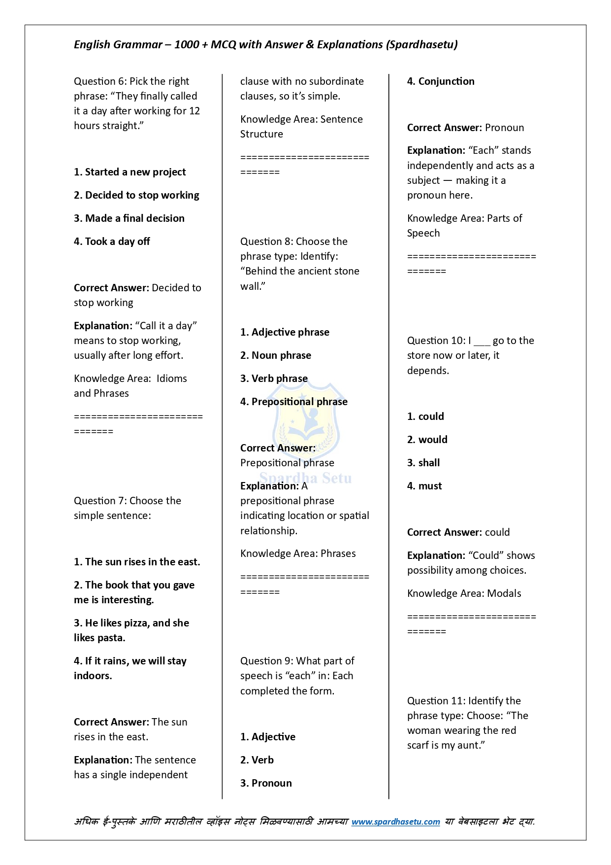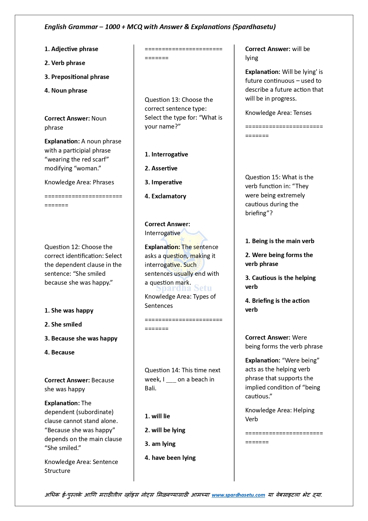 рд╣реЗ рдИ-рдмреБрдХ рдЗрдВрдЧреНрд░рдЬреА рд╡реНрдпрд╛рдХрд░рдгрд╛рддреАрд▓ 1000+ рдмрд╣реБрдкрд░реНрдпрд╛рдпреА рдкреНрд░рд╢реНрди, рддреНрдпрд╛рдВрдЪреА рдЕрдЪреВрдХ рдЙрддреНрддрд░реЗ рдЖрдгрд┐ рд╕рд╡рд┐рд╕реНрддрд░ рд╕реНрдкрд╖реНрдЯреАрдХрд░рдгреЗ рдпрд╛рдВрдЪрд╛ рд╕рдВрдкреВрд░реНрдг рд╕рдВрдЧреНрд░рд╣ рдкреНрд░рджрд╛рди рдХрд░рддреЗ. Tenses, Voice, Narration, Modals, Prepositions, Articles, Error Detection, Sentence Improvement рдЕрд╢рд╛ рд╕рд░реНрд╡ рдорд╣рддреНрддреНрд╡рд╛рдЪреНрдпрд╛ рдЕрдзреНрдпрд╛рдпрд╛рдВрддреАрд▓ рдкреНрд░рд╢реНрди рдкрд░реАрдХреНрд╖рд╛-рдкреЕрдЯрд░реНрдирдиреБрд╕рд╛рд░ рд╕рдЬрд╡рд▓реЗрд▓реЗ рдЖрд╣реЗрдд. рд╕реНрдкрд╖реНрдЯреАрдХрд░рдгрд╛рдВрдореБрд│реЗ рд╡рд┐рджреНрдпрд╛рд░реНрдереА рдирд┐рдпрдо рд╕рдордЬреВрди рдШреЗрддрд╛рдд рдЖрдгрд┐ рдЪреБрдХрд╛ рдУрд│рдЦрдгреНрдпрд╛рдЪреА рдХреНрд╖рдорддрд╛ рд╡рд╛рдврддреЗ. SSC, Banking, Railway, MPSC, UPSC рдЖрдгрд┐ рд╕рд░реНрд╡ рдЗрдВрдЧреНрд░рдЬреА рд╕реНрдкрд░реНрдзрд╛ рдкрд░реАрдХреНрд╖рд╛рдВрд╕рд╛рдареА рд╣реЗ рдИ-рдмреБрдХ рдЕрддреНрдпрдВрдд рдЙрдкрдпреБрдХреНрдд рдард░рддреЗ.