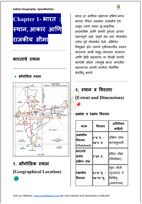 рд╣реЗ рднрд╛рд░рддрд╛рдЪрд╛ рднреВрдЧреЛрд▓ рдИ-рдмреБрдХ рд╡рд┐рджреНрдпрд╛рд░реНрдереНрдпрд╛рдВрд╕рд╛рдареА foundation level рд╡рд░ рддрдпрд╛рд░ рдХрд░рдгреНрдпрд╛рдд рдЖрд▓реЗ рдЖрд╣реЗ. рднрд╛рд░рддрд╛рдЪрд╛ рднреМрддрд┐рдХ рднреВрдЧреЛрд▓, рд╣рд╡рд╛рдорд╛рди, рдирджреНрдпрд╛, рдорд╛рддреА, рдиреИрд╕рд░реНрдЧрд┐рдХ рд╕рд╛рдзрдирд╕рдВрдкрддреНрддреА, рд╢реЗрддреА, рдЙрджреНрдпреЛрдЧ рд╡ рд▓реЛрдХрд╕рдВрдЦреНрдпрд╛ рдпрд╛рдВрдЪрд╛ рдЕрднреНрдпрд╛рд╕ рд╕реЛрдкреНрдпрд╛, рд╕реНрдкрд╖реНрдЯ рдЖрдгрд┐ рдХреНрд░рдордмрджреНрдз рднрд╛рд╖реЗрдд рдорд╛рдВрдбрдгреНрдпрд╛рдд рдЖрд▓рд╛ рдЖрд╣реЗ. MPSC, UPSC, рдорд╣рд╛рд░рд╛рд╖реНрдЯреНрд░ рдкреЛрд▓реАрд╕ рднрд░рддреА, рддрд▓рд╛рдареА рддрд╕реЗрдЪ рдЗрддрд░ рд╕рд░реНрд╡ рд╕реНрдкрд░реНрдзрд╛ рдкрд░реАрдХреНрд╖рд╛рдВрд╕рд╛рдареА рдЖрд╡рд╢реНрдпрдХ рдЕрд╕рд▓реЗрд▓реА рдореВрд▓рднреВрдд рднреМрдЧреЛрд▓рд┐рдХ рд╕рдордЬ рд╡рд┐рдХрд╕рд┐рдд рдХрд░рдгреНрдпрд╛рд╕рд╛рдареА рд╣реЗ рдкреБрд╕реНрддрдХ рдЙрдкрдпреБрдХреНрдд рдЖрд╣реЗ.