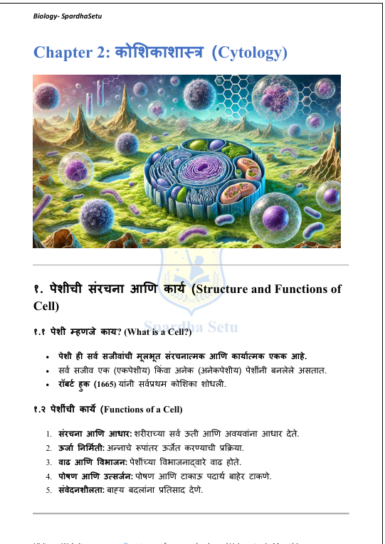 рд╣реЗ рдЬреАрд╡рд╢рд╛рд╕реНрддреНрд░ рдИ-рдмреБрдХ рд╡рд┐рджреНрдпрд╛рд░реНрдереНрдпрд╛рдВрд╕рд╛рдареА foundation level рд╡рд░ рддрдпрд╛рд░ рдХрд░рдгреНрдпрд╛рдд рдЖрд▓реЗ рдЖрд╣реЗ. рдкреЗрд╢реА рд░рдЪрдирд╛, рд╕рдЬреАрд╡рд╛рдВрдЪреА рд╡реИрд╢рд┐рд╖реНрдЯреНрдпреЗ, рд╡рдирд╕реНрдкрддреА рд╡ рдкреНрд░рд╛рдгреА рдЬрдЧ, рдорд╛рдирд╡реА рд╢рд░реАрд░рд░рдЪрдирд╛, рдкреЛрд╖рдг, рд╢реНрд╡рд╕рди, рдкреНрд░рдЬрдирди рд╡ рдкрд░реНрдпрд╛рд╡рд░рдг рдпрд╛рдВрд╕рд╛рд░рдЦреНрдпрд╛ рдореВрд▓рднреВрдд рдШрдЯрдХрд╛рдВрдЪрд╛ рдЕрднреНрдпрд╛рд╕ рд╕реЛрдкреНрдпрд╛, рд╕реНрдкрд╖реНрдЯ рдЖрдгрд┐ рдХреНрд░рдордмрджреНрдз рднрд╛рд╖реЗрдд рдорд╛рдВрдбрдгреНрдпрд╛рдд рдЖрд▓рд╛ рдЖрд╣реЗ. MPSC, UPSC, рдорд╣рд╛рд░рд╛рд╖реНрдЯреНрд░ рдкреЛрд▓реАрд╕ рднрд░рддреА, рддрд▓рд╛рдареА рддрд╕реЗрдЪ рдЗрддрд░ рд╕рд░реНрд╡ рд╕реНрдкрд░реНрдзрд╛ рдкрд░реАрдХреНрд╖рд╛рдВрд╕рд╛рдареА рдЖрд╡рд╢реНрдпрдХ рдЕрд╕рд▓реЗрд▓реА рдЬреАрд╡рд╢рд╛рд╕реНрддреНрд░рд╛рдЪреА рдореВрд▓рднреВрдд рд╕рдВрдХрд▓реНрдкрдирд╛рддреНрдордХ рд╕рдордЬ рд╡рд┐рдХрд╕рд┐рдд рдХрд░рдгреНрдпрд╛рд╕рд╛рдареА рд╣реЗ рдкреБрд╕реНрддрдХ рдЙрдкрдпреБрдХреНрдд рдЖрд╣реЗ.