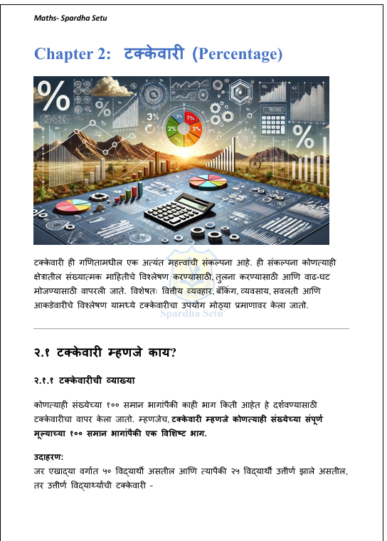 рд╣реЗ рдЧрдгрд┐рдд рдИ-рдмреБрдХ foundation level рд╡рд░ рддрдпрд╛рд░ рдХрд░рдгреНрдпрд╛рдд рдЖрд▓реЗ рдЖрд╣реЗ. рд╕рдВрдЦреНрдпрд╛ рдкреНрд░рдгрд╛рд▓реА, рдЯрдХреНрдХреЗрд╡рд╛рд░реА, рдЕрдиреБрдкрд╛рдд-рдкреНрд░рдорд╛рдг, рд╕рд░рд╛рд╕рд░реА, рдирдлрд╛-рддреЛрдЯрд╛, рд╡реНрдпрд╛рдЬ, рд╡реЗрдЧ-рд╡реЗрд│-рдЕрдВрддрд░, рдХрд╛рдо-рд╡реЗрд│ рд╡ рд╕рдВрдЦреНрдпрд╛рддреНрдордХ рдХреНрд╖рдорддрд╛ рдпрд╛рдВрд╕рд╛рд░рдЦреНрдпрд╛ рдореВрд▓рднреВрдд рдЧрдгрд┐рддреА рдШрдЯрдХрд╛рдВрдЪрд╛ рдЕрднреНрдпрд╛рд╕ рд╕реЛрдкреНрдпрд╛, рд╕реНрдкрд╖реНрдЯ рдЖрдгрд┐ рдЙрджрд╛рд╣рд░рдгрд╛рдзрд╛рд░рд┐рдд рднрд╛рд╖реЗрдд рдорд╛рдВрдбрдгреНрдпрд╛рдд рдЖрд▓рд╛ рдЖрд╣реЗ. MPSC, UPSC, рдорд╣рд╛рд░рд╛рд╖реНрдЯреНрд░ рдкреЛрд▓реАрд╕ рднрд░рддреА, рддрд▓рд╛рдареА рддрд╕реЗрдЪ рдЗрддрд░ рд╕рд░реНрд╡ рд╕реНрдкрд░реНрдзрд╛ рдкрд░реАрдХреНрд╖рд╛рдВрд╕рд╛рдареА рдЖрд╡рд╢реНрдпрдХ рдЕрд╕рд▓реЗрд▓реА рдЧрдгрд┐рддрд╛рдЪреА рдореВрд▓рднреВрдд рд╕рдордЬ рд╡рд┐рдХрд╕рд┐рдд рдХрд░рдгреНрдпрд╛рд╕рд╛рдареА рд╣реЗ рдкреБрд╕реНрддрдХ рдЙрдкрдпреБрдХреНрдд рдЖрд╣реЗ.