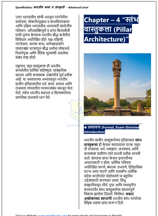 рд╣реЗ рднрд╛рд░рддреАрдп рдХрд▓рд╛ рд╡ рд╕рдВрд╕реНрдХреГрддреА рдИ-рдмреБрдХ (PDF рд╕реНрд╡рд░реВрдкрд╛рдд) Intermediate рддреЗ Advanced Level рд╡рд░реАрд▓ рд╡рд┐рджреНрдпрд╛рд░реНрдереНрдпрд╛рдВрд╕рд╛рдареА MPSC рд╡ UPSC Mains рдкрд░реАрдХреНрд╖рд╛рдВрдЪреНрдпрд╛ рддрдпрд╛рд░реАрд╕рд╛рдареА рддрдпрд╛рд░ рдХрд░рдгреНрдпрд╛рдд рдЖрд▓реЗ рдЖрд╣реЗ. рдЪрд┐рддреНрд░рдХрд▓рд╛, рд╢рд┐рд▓реНрдкрдХрд▓рд╛, рд╕реНрдерд╛рдкрддреНрдп, рдиреГрддреНрдп, рд╕рдВрдЧреАрдд, рд▓реЛрдХрдХрд▓рд╛ рд╡ рд╕рд╛рдВрд╕реНрдХреГрддрд┐рдХ рд╡рд╛рд░рд╕рд╛ рдпрд╛рдВрдЪрд╛ рдЕрднреНрдпрд╛рд╕ рд╡рд┐рд╢реНрд▓реЗрд╖рдгрд╛рддреНрдордХ рд╡ рдЙрддреНрддрд░рд▓реЗрдЦрдирд╛рднрд┐рдореБрдЦ рдкрджреНрдзрддреАрдиреЗ рдорд╛рдВрдбрдгреНрдпрд╛рдд рдЖрд▓рд╛ рдЖрд╣реЗ. рд╕рдВрдХрд▓реНрдкрдирд╛рдВрдЪреА рд╕рдЦреЛрд▓ рдорд╛рдВрдбрдгреА, рдкрд░рд╕реНрдкрд░рд╕рдВрдмрдВрдз рд╡ рдкрд░реАрдХреНрд╖реЗрдд рдЕрдкреЗрдХреНрд╖рд┐рдд рджреГрд╖реНрдЯрд┐рдХреЛрдирд╛рд╡рд░ рд╡рд┐рд╢реЗрд╖ рднрд░ рджреЗрдгреНрдпрд╛рдд рдЖрд▓рд╛ рдЖрд╣реЗ. MPSC рд╡ UPSC (Mains/Advanced) рддрд╕реЗрдЪ рдЗрддрд░ рдЙрдЪреНрдЪрд╕реНрддрд░реАрдп рд╕реНрдкрд░реНрдзрд╛ рдкрд░реАрдХреНрд╖рд╛рдВрд╕рд╛рдареА рд╣реЗ рдПрдХ рдЙрдкрдпреБрдХреНрдд рд╕рдВрджрд░реНрднрдЧреНрд░рдВрде рдЖрд╣реЗ.