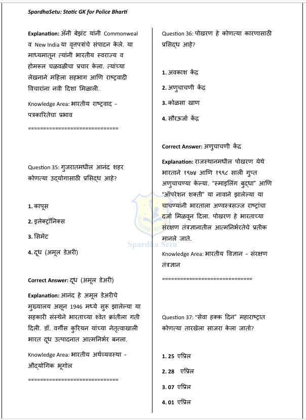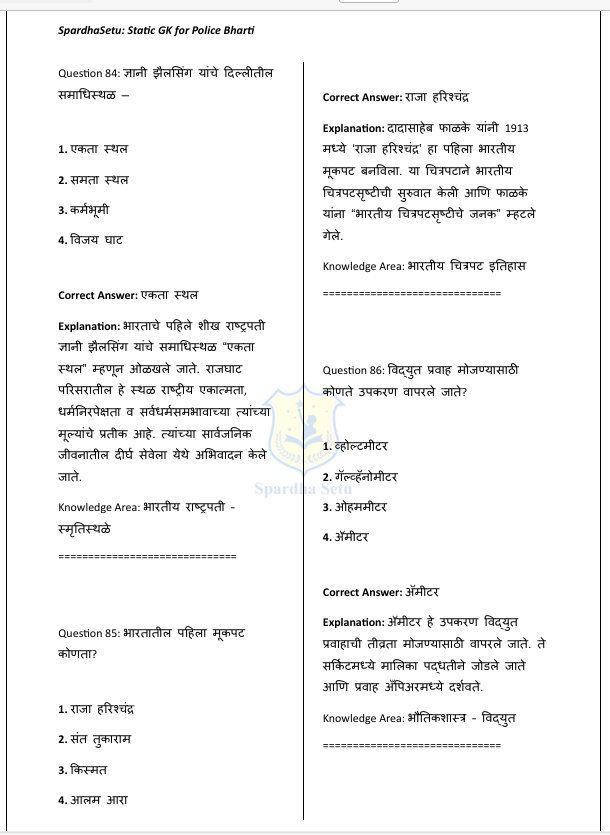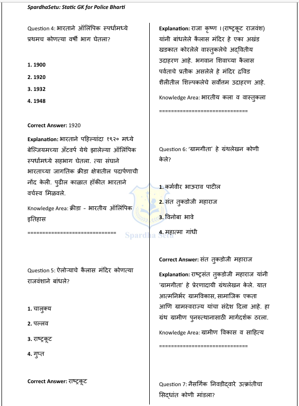 рд╣реЗ рдкреЛрд▓реАрд╕ рднрд░рддреА Static GK рдИ-рдмреБрдХ (500+ GK Questions) рдорд╣рд╛рд░рд╛рд╖реНрдЯреНрд░ рдкреЛрд▓реАрд╕ рднрд░рддреА рдкрд░реАрдХреНрд╖реЗрдЪреНрдпрд╛ рдЕрднреНрдпрд╛рд╕рдХреНрд░рдорд╛рд╡рд░ рдЖрдзрд╛рд░рд┐рдд рддрдпрд╛рд░ рдХрд░рдгреНрдпрд╛рдд рдЖрд▓реЗ рдЖрд╣реЗ. рдЗрддрд┐рд╣рд╛рд╕, рднреВрдЧреЛрд▓, рд░рд╛рдЬреНрдпрд╢рд╛рд╕реНрддреНрд░, рдЕрд░реНрдерд╢рд╛рд╕реНрддреНрд░, рд╡рд┐рдЬреНрдЮрд╛рди, рд╕рдВрд╡рд┐рдзрд╛рди, рдорд╣рд╛рд░рд╛рд╖реНрдЯреНрд░ рд╡рд┐рд╢реЗрд╖ рдорд╛рд╣рд┐рддреА рд╡ рд╕рд╛рдорд╛рдиреНрдп рдЬреНрдЮрд╛рдирд╛рд╢реА рд╕рдВрдмрдВрдзрд┐рдд рд╕реНрдерд┐рд░ (Static) рдШрдЯрдХрд╛рдВрдЪрд╛ рдЕрднреНрдпрд╛рд╕ рд╕реЛрдкреНрдпрд╛, рд╕реНрдкрд╖реНрдЯ рдЖрдгрд┐ рдореБрджреНрджреЗрд╕реВрдж рднрд╛рд╖реЗрдд рдорд╛рдВрдбрдгреНрдпрд╛рдд рдЖрд▓рд╛ рдЖрд╣реЗ. рдкрд░реАрдХреНрд╖реЗрдд рд╡рд╛рд░рдВрд╡рд╛рд░ рд╡рд┐рдЪрд╛рд░рд▓реНрдпрд╛ рдЬрд╛рдгрд╛рд▒реНрдпрд╛ рд╡рд┐рд╖рдпрд╛рдВрд╡рд░ рднрд░ рджреЗрдгреНрдпрд╛рдд рдЖрд▓рд╛ рдЕрд╕реВрди рдкреЛрд▓реАрд╕ рднрд░рддреА, Group-C рд╡ рдЗрддрд░ рд╕рдВрдмрдВрдзрд┐рдд рд╕реНрдкрд░реНрдзрд╛ рдкрд░реАрдХреНрд╖рд╛рдВрд╕рд╛рдареА рд╣реЗ рдкреБрд╕реНрддрдХ рдЙрдкрдпреБрдХреНрдд рдард░рддреЗ.
