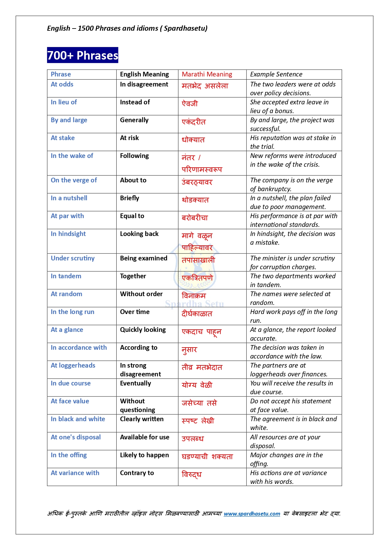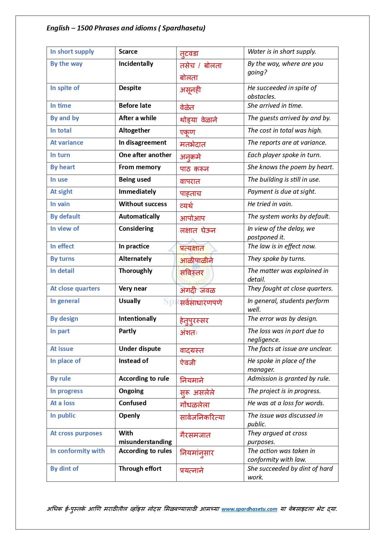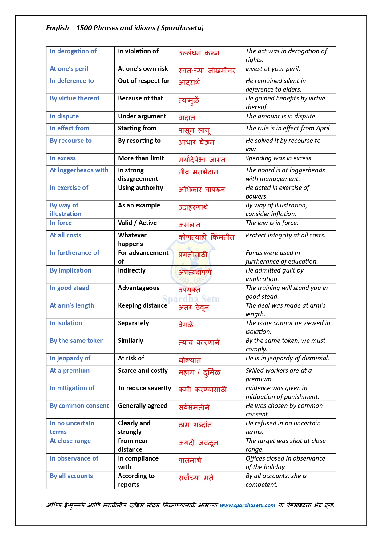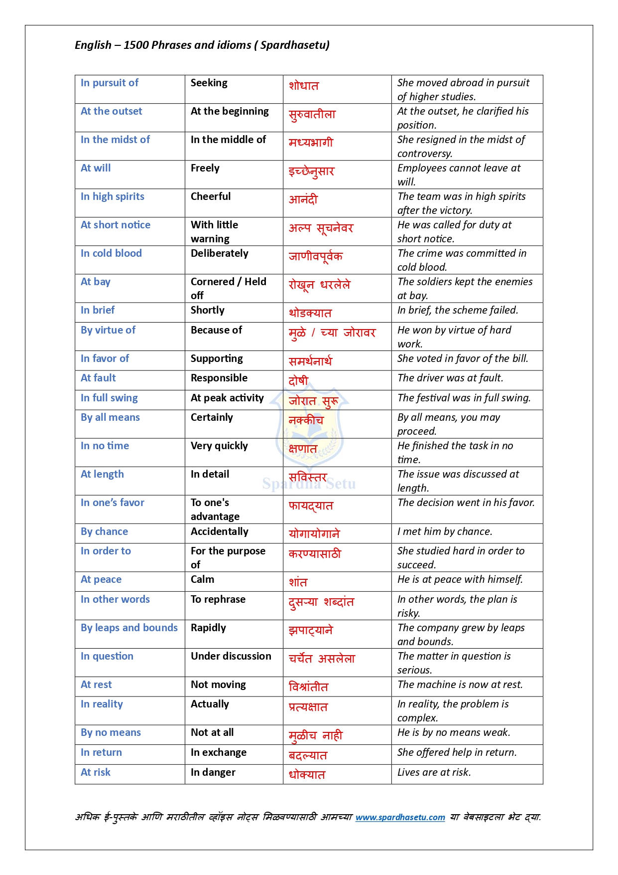 рдпрд╛ рдИ-рдмреБрдХрдордзреНрдпреЗ рдЗрдВрдЧреНрд░рдЬреАрддреАрд▓ резрелрежреж рдкреЗрдХреНрд╖рд╛ рдЕрдзрд┐рдХ рдорд╣рддреНрддреНрд╡рд╛рдЪреНрдпрд╛ Phrases рдЖрдгрд┐ Idioms рдЪреЗ рдЕрдЪреВрдХ рдЕрд░реНрде, рд╕реЛрдкреЗ рд╕реНрдкрд╖реНрдЯреАрдХрд░рдг рдЖрдгрд┐ рдЙрджрд╛рд╣рд░рдгрд╛рдВрд╕рд╣ рд╕рд╡рд┐рд╕реНрддрд░ рд╕рдВрдХрд▓рди рджрд┐рд▓реЗ рдЖрд╣реЗ. рджреИрдирдВрджрд┐рди рдЗрдВрдЧреНрд░рдЬреА рд╡рд╛рдкрд░, рд▓реЗрдЦрди, рдмреЛрд▓рдгреЗ рдЖрдгрд┐ рд╕реНрдкрд░реНрдзрд╛ рдкрд░реАрдХреНрд╖рд╛рдВрдордзреНрдпреЗ рд╡рд┐рдЪрд╛рд░рд▓реЗ рдЬрд╛рдгрд╛рд░реЗ рдкреНрд░рд╢реНрди рд╕реЛрдбрд╡рдгреНрдпрд╛рд╕рд╛рдареА рд╣реЗ рдкреБрд╕реНрддрдХ рдЕрддреНрдпрдВрдд рдЙрдкрдпреБрдХреНрдд рдард░рддреЗ. рд╕реНрдкрд╖реНрдЯ рдЕрд░реНрдердЫрдЯрд╛, рддреНрд╡рд░рд┐рдд рдЖрдард╡рдгреАрдд рд░рд╛рд╣рддреАрд▓ рдЕрд╢реА рдЙрджрд╛рд╣рд░рдгреЗ рдЖрдгрд┐ рдкрд░реАрдХреНрд╖рд╛-рдкреЕрдЯрд░реНрдирдиреБрд╕рд╛рд░ рд░рдЪрдирд╛ рдпрд╛рдореБрд│реЗ Vocabulary рдЖрдгрд┐ Communication Skills рдордЬрдмреВрдд рд╣реЛрддрд╛рдд. SSC, Banking, Railway, MPSC, UPSC рдЖрдгрд┐ рд╕рд░реНрд╡ English рдкрд░реАрдХреНрд╖рд╛рдВрд╕рд╛рдареА рд╣реЗ рдИ-рдмреБрдХ рдПрдХ рдкреНрд░рднрд╛рд╡реА рдорд╛рд░реНрдЧрджрд░реНрд╢рдХ рдЖрд╣реЗ.