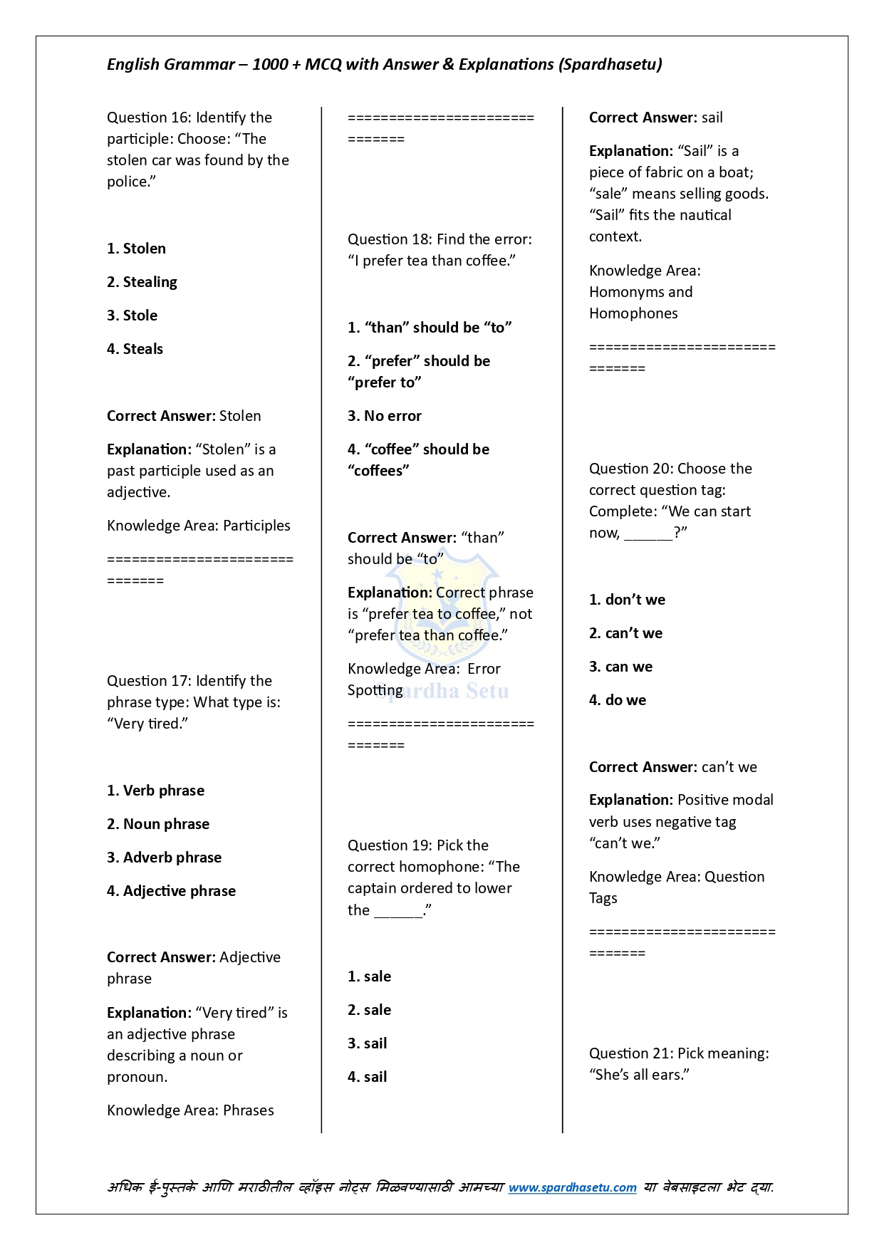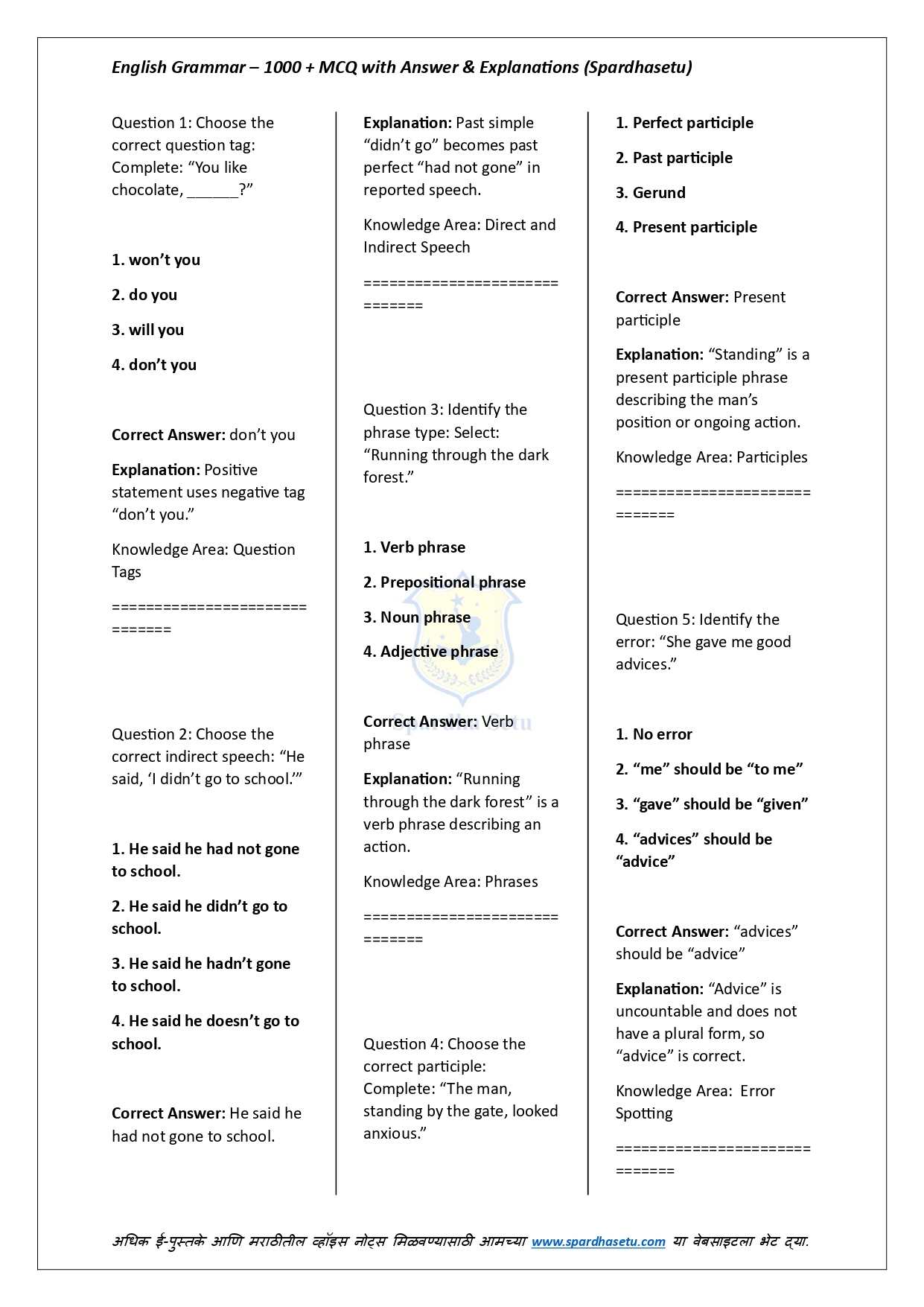 рд╣реЗ рдИ-рдмреБрдХ рдЗрдВрдЧреНрд░рдЬреА рд╡реНрдпрд╛рдХрд░рдгрд╛рддреАрд▓ 1000+ рдмрд╣реБрдкрд░реНрдпрд╛рдпреА рдкреНрд░рд╢реНрди, рддреНрдпрд╛рдВрдЪреА рдЕрдЪреВрдХ рдЙрддреНрддрд░реЗ рдЖрдгрд┐ рд╕рд╡рд┐рд╕реНрддрд░ рд╕реНрдкрд╖реНрдЯреАрдХрд░рдгреЗ рдпрд╛рдВрдЪрд╛ рд╕рдВрдкреВрд░реНрдг рд╕рдВрдЧреНрд░рд╣ рдкреНрд░рджрд╛рди рдХрд░рддреЗ. Tenses, Voice, Narration, Modals, Prepositions, Articles, Error Detection, Sentence Improvement рдЕрд╢рд╛ рд╕рд░реНрд╡ рдорд╣рддреНрддреНрд╡рд╛рдЪреНрдпрд╛ рдЕрдзреНрдпрд╛рдпрд╛рдВрддреАрд▓ рдкреНрд░рд╢реНрди рдкрд░реАрдХреНрд╖рд╛-рдкреЕрдЯрд░реНрдирдиреБрд╕рд╛рд░ рд╕рдЬрд╡рд▓реЗрд▓реЗ рдЖрд╣реЗрдд. рд╕реНрдкрд╖реНрдЯреАрдХрд░рдгрд╛рдВрдореБрд│реЗ рд╡рд┐рджреНрдпрд╛рд░реНрдереА рдирд┐рдпрдо рд╕рдордЬреВрди рдШреЗрддрд╛рдд рдЖрдгрд┐ рдЪреБрдХрд╛ рдУрд│рдЦрдгреНрдпрд╛рдЪреА рдХреНрд╖рдорддрд╛ рд╡рд╛рдврддреЗ. SSC, Banking, Railway, MPSC, UPSC рдЖрдгрд┐ рд╕рд░реНрд╡ рдЗрдВрдЧреНрд░рдЬреА рд╕реНрдкрд░реНрдзрд╛ рдкрд░реАрдХреНрд╖рд╛рдВрд╕рд╛рдареА рд╣реЗ рдИ-рдмреБрдХ рдЕрддреНрдпрдВрдд рдЙрдкрдпреБрдХреНрдд рдард░рддреЗ.