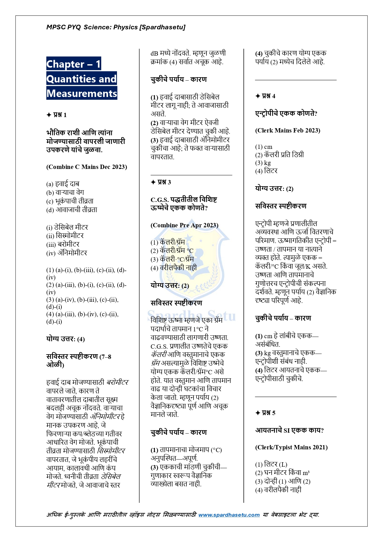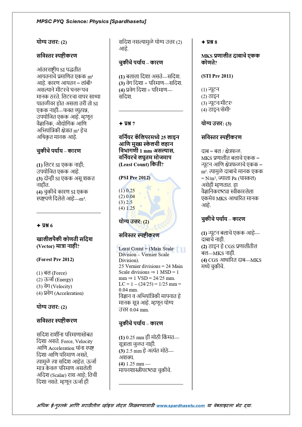 рд╣реЗ рдИ-рдмреБрдХ MPSC рдкрд░реАрдХреНрд╖реЗрдд рд╡рд┐рдЪрд╛рд░рд▓реЗрд▓реНрдпрд╛ рднреМрддрд┐рдХрд╢рд╛рд╕реНрддреНрд░ рд╡рд┐рд╖рдпрд╛рдЪреНрдпрд╛ рд╕рд░реНрд╡ рдорд╣рддреНрддреНрд╡рдкреВрд░реНрдг PYQs рдЪреЗ рдЕрдЪреВрдХ, рдЕрджреНрдпрдпрд╛рд╡рдд рдЖрдгрд┐ рд╡рд┐рд╢реНрд▓реЗрд╖рдгрд╛рддреНрдордХ рд╕рдВрдХрд▓рди рдЖрд╣реЗ. рдЧрддреА, рдмрд▓, рдКрд░реНрдЬрд╛, рдЙрд╖реНрдгрддрд╛, рдкреНрд░рдХрд╛рд╢, рдзреНрд╡рдиреА, рд╡рд┐рджреНрдпреБрдд рд╡ рдЪреБрдВрдмрдХрддреНрд╡ рдпрд╛рдВрд╕рд╛рд░рдЦреНрдпрд╛ рдЕрдзреНрдпрд╛рдпрд╛рдВрд╡рд░реАрд▓ рдкреНрд░рд╢реНрдирд╛рдВрдирд╛ рд╕рд╡рд┐рд╕реНрддрд░ рд╕реНрдкрд╖реНрдЯреАрдХрд░рдгреЗ рджреЗрдКрди рдореВрд▓рднреВрдд рд╕рдВрдХрд▓реНрдкрдирд╛ рджреГрдв рдХрд░рдгреНрдпрд╛рд╡рд░ рдкреБрд╕реНрддрдХрд╛рдЪрд╛ рд╡рд┐рд╢реЗрд╖ рднрд░ рдЖрд╣реЗ. рдкреНрд░рддреНрдпреЗрдХ рдкреНрд░рд╢реНрдирд╛рдЪреЗ рдХрд╛рд░рдгрдореАрдорд╛рдВрд╕рд╛тАУрдЖрдзрд╛рд░рд┐рдд рд╡рд┐рд╢реНрд▓реЗрд╖рдг рд╡рд┐рджреНрдпрд╛рд░реНрдереНрдпрд╛рдВрдирд╛ рдирд╡реАрди рд╡ рдмрджрд▓рд▓реЗрд▓реНрдпрд╛ рдкреЕрдЯрд░реНрдирд╡рд░реАрд▓ рдкреНрд░рд╢реНрдирд╣реА рдЖрддреНрдорд╡рд┐рд╢реНрд╡рд╛рд╕рд╛рдиреЗ рд╕реЛрдбрд╡рддрд╛ рдпреЗрдИрд▓ рдЕрд╢реА рдХреНрд╖рдорддрд╛ рд╡рд┐рдХрд╕рд┐рдд рдХрд░рддреЗ. MPSC Prelims, рд╕рд░рд│рд╕реЗрд╡рд╛ рдЖрдгрд┐ рдЗрддрд░ рд╕рд░реНрд╡ рд╡рд┐рдЬреНрдЮрд╛рдирд╛рдзрд╛рд░рд┐рдд рд╕реНрдкрд░реНрдзрд╛ рдкрд░реАрдХреНрд╖рд╛рдВрд╕рд╛рдареА рд╣реЗ рдИ-рдмреБрдХ рдЕрддреНрдпрдВрдд рдЙрдкрдпреБрдХреНрдд рдард░рддреЗ.