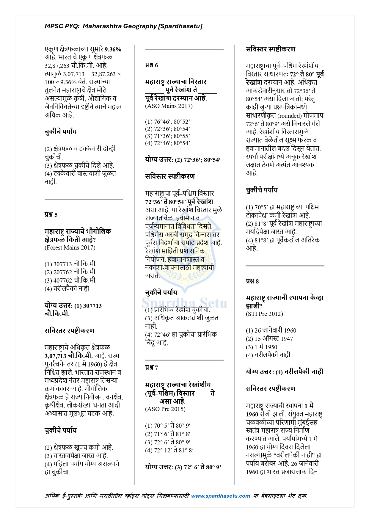 рд╣реЗ рдИ-рдмреБрдХ MPSC рдкрд░реАрдХреНрд╖реЗрдд рд╡рд┐рдЪрд╛рд░рд▓реЗрд▓реНрдпрд╛ рдорд╣рд╛рд░рд╛рд╖реНрдЯреНрд░рд╛рдЪреНрдпрд╛ рднреВрдЧреЛрд▓рд╛рддреАрд▓ рд╕рд░реНрд╡ рдорд╣рддреНрддреНрд╡рдкреВрд░реНрдг PYQs рдЪреЗ рдЕрдЪреВрдХ, рд╡реНрдпрд╡рд╕реНрдерд┐рдд рд╡ рд╕рдЦреЛрд▓ рд╡рд┐рд╢реНрд▓реЗрд╖рдгрд╛рд╕рд╣ рд╕рдВрдХрд▓рди рдЖрд╣реЗ. рднреМрдЧреЛрд▓рд┐рдХ рд╡рд┐рднрд╛рдЧ, рд╕рд╣реНрдпрд╛рджреНрд░реАтАУрд╡рд┐рджрд░реНрднтАУрдорд░рд╛рдард╡рд╛рдбрд╛тАУрдХреЛрдВрдХрдгрдЪреА рд╡реИрд╢рд┐рд╖реНрдЯреНрдпреЗ, рдирджреНрдпрд╛, рд╣рд╡рд╛рдорд╛рди, рдореГрджрд╛рдкреНрд░рдХрд╛рд░, рд╢реЗрддреА рдкрджреНрдзрддреА, рдЙрджреНрдпреЛрдЧ, рдЦрдирд┐рдЬрд╕рдВрдкрджрд╛, рдЬрд▓рд╕реНрд░реЛрдд, рд▓реЛрдХрд╕рдВрдЦреНрдпрд╛ рд╡ рдкрд░реНрдпрд╛рд╡рд░рдг рдЕрд╢рд╛ рд╕рд░реНрд╡ рдЕрдзреНрдпрд╛рдпрд╛рдВрдЪреЗ рдкреНрд░рд╢реНрди рддрд░реНрдХрд╢реБрджреНрдз рд╕реНрдкрд╖реНрдЯреАрдХрд░рдгрд╛рд╕рд╣ рд╕рд╛рджрд░ рдХреЗрд▓реЗ рдЖрд╣реЗрдд. рдирдХрд╛рд╢рд╛рддреНрдордХ рд╕рдВрджрд░реНрдн, рдХрд╛рд░рдгрдореАрдорд╛рдВрд╕рд╛ рдЖрдгрд┐ рдЕрд╡рдзрд╛рд░рдгрд╛рдВрдЪреЗ рд╕рдВрдХреНрд╖рд┐рдкреНрдд рд╡рд┐рд╢реНрд▓реЗрд╖рдг рд╡рд┐рджреНрдпрд╛рд░реНрдереНрдпрд╛рдВрдЪреА рд╕рдВрдХрд▓реНрдкрдирд╛рддреНрдордХ рдкрдХрдб рдордЬрдмреВрдд рдХрд░рддреЗ. MPSC Prelims, Group-B/C рдЖрдгрд┐ рд╕рд░реНрд╡ рднреВрдЧреЛрд▓рд╛рдзрд╛рд░рд┐рдд рдкрд░реАрдХреНрд╖рд╛рдВрд╕рд╛рдареА рд╣реЗ рдИ-рдмреБрдХ рдЕрддреНрдпрдВрдд рдЙрдкрдпреБрдХреНрдд рдард░рддреЗ.